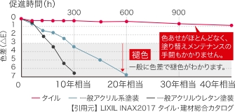 タイルは紫外線に強い無機質セラミックス。40年相当を経過しても、色あせがほとんどないという実験結果が得られています。